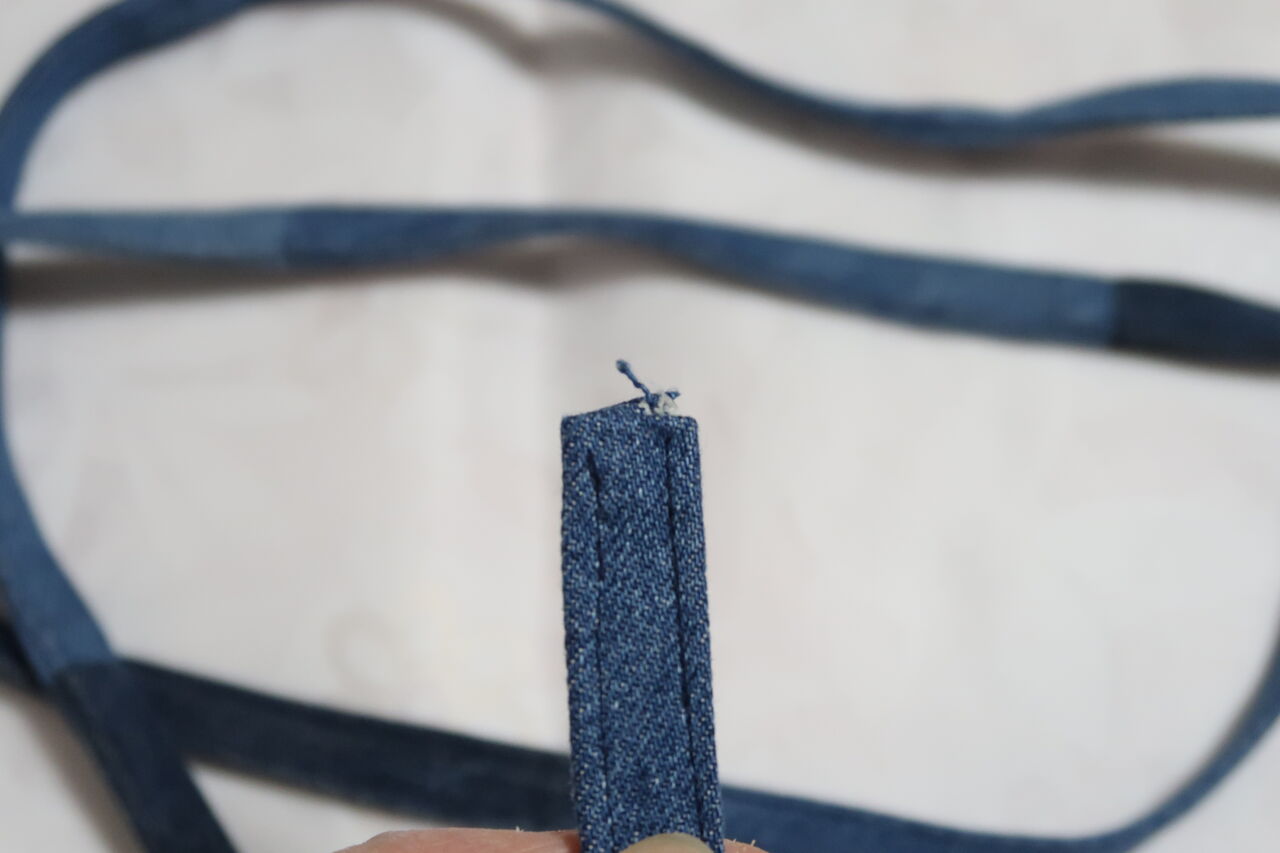 2、肩掛けヒモは布130センチ以上必要です。細かく切ってしまったので、繋ぎ合わせてヒモを作りました。