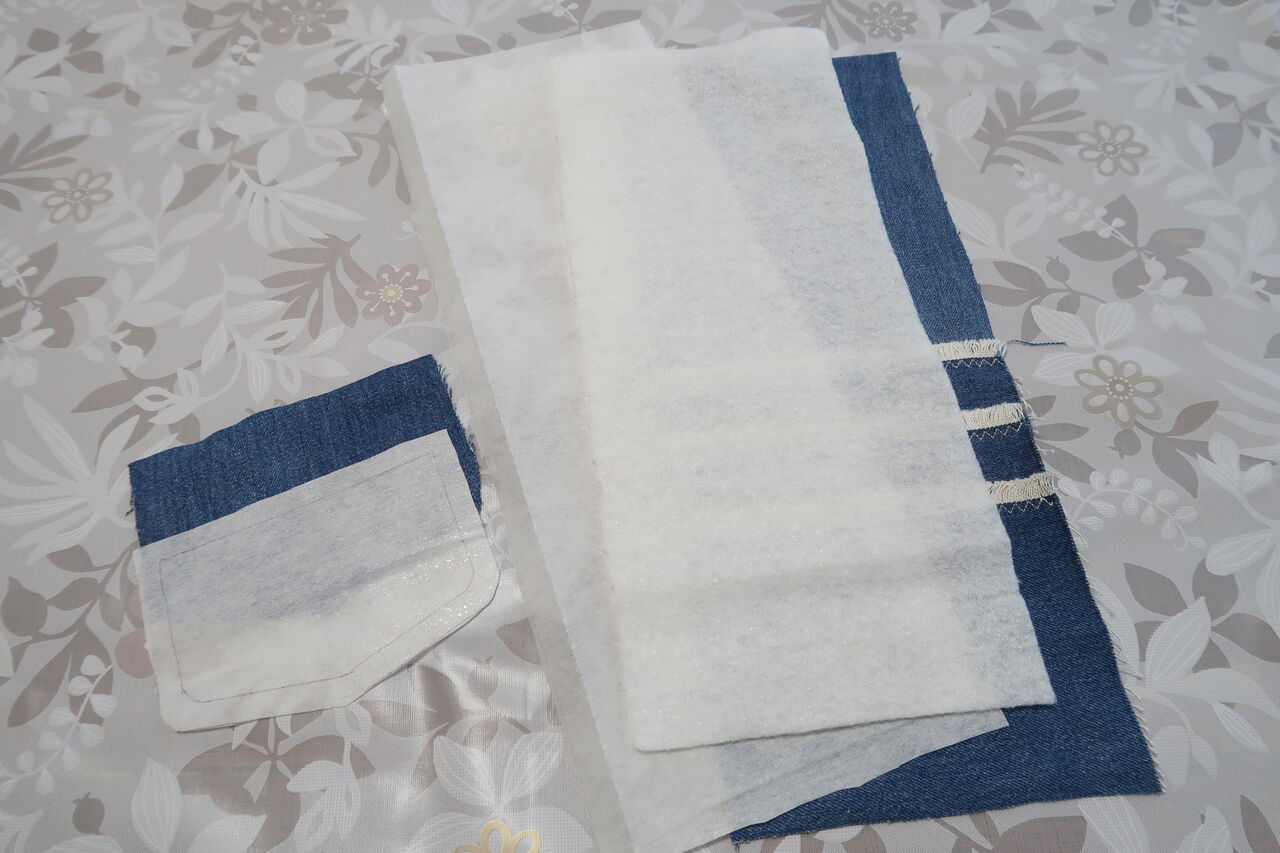 フリジンの布を15センチ1枚、5センチが2枚の合計3枚と、フリジンを入れない裏側の布24センチ用意します。フリジンを施した布は後で切ってもいいように縦横に2〜3センチ長めに切っておくと安心です。
