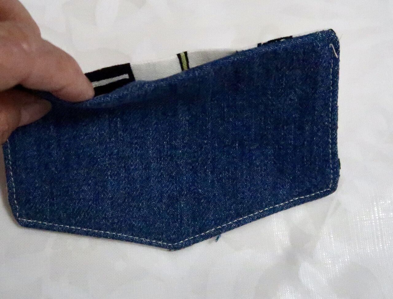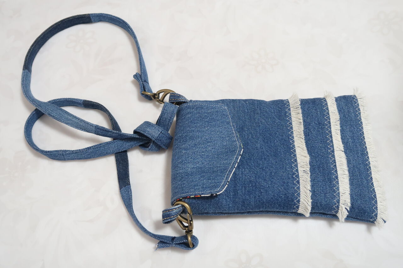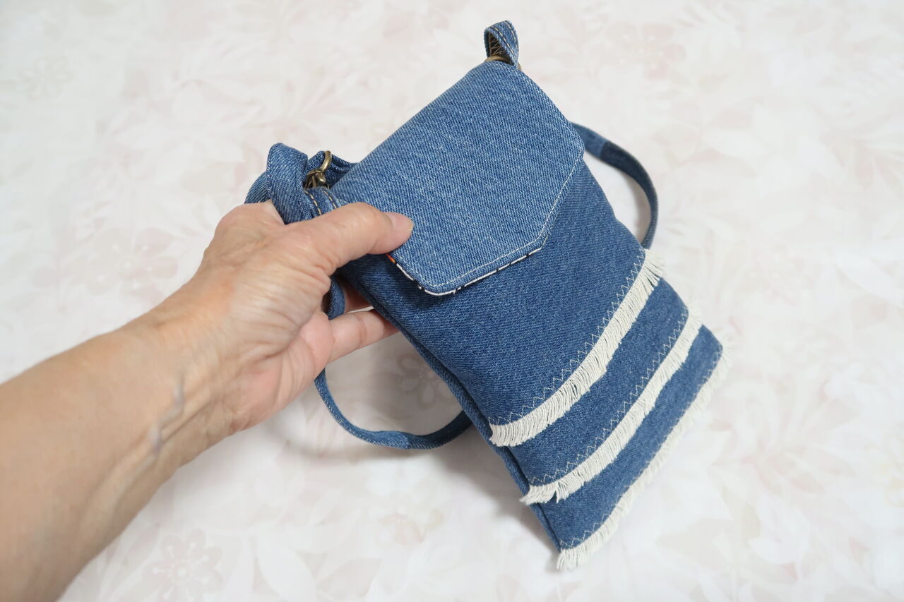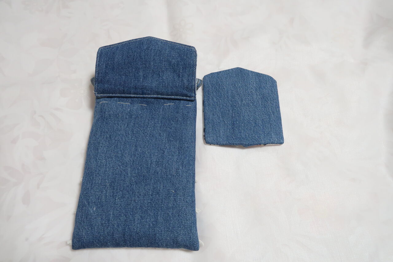 お古のジーンズでスマホ用ポーチを作りました。スマホは持っていないので正確には「ガラケーポーチ」です。お財布やメモ帳・ペンなど収納できます。