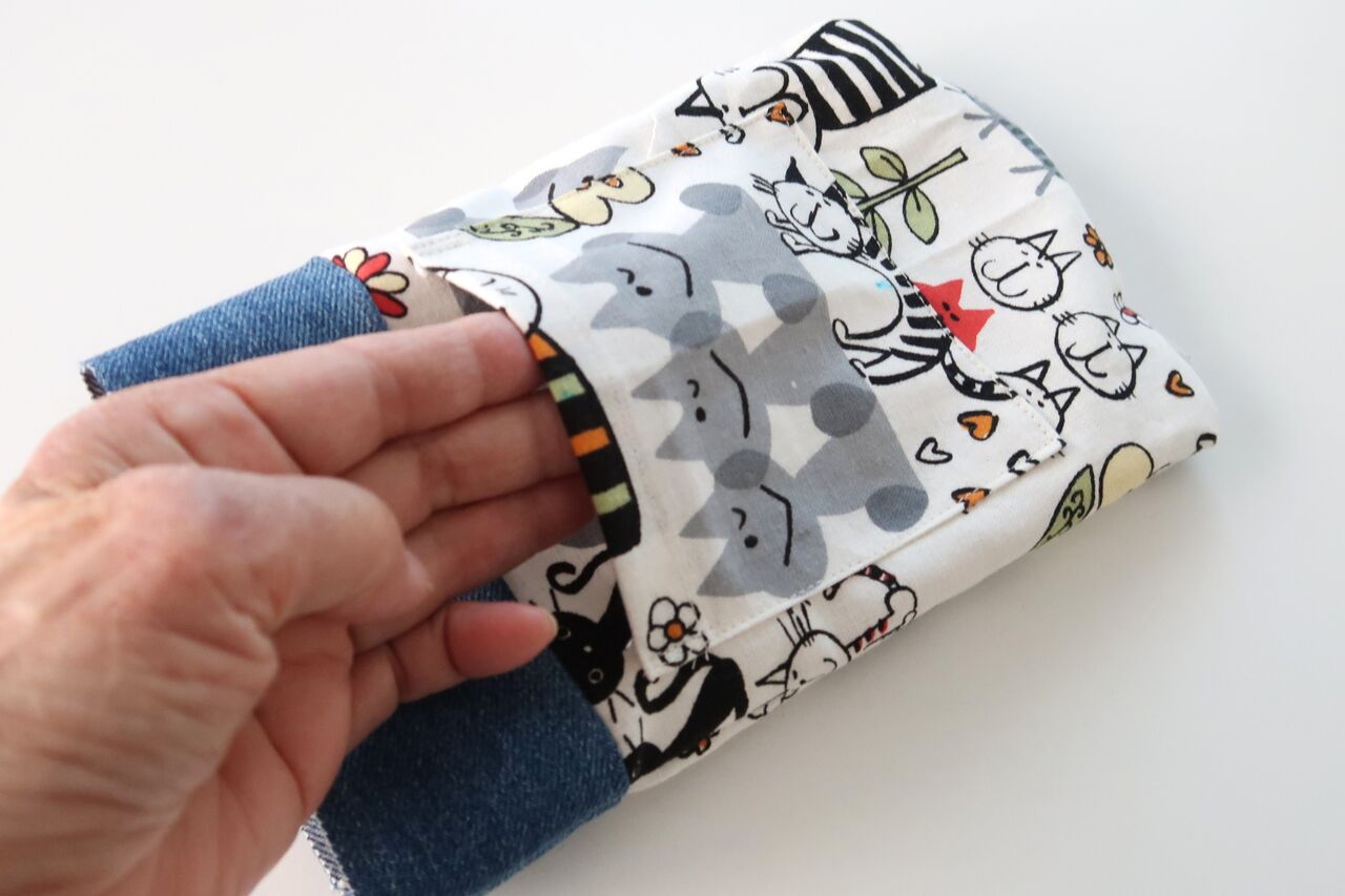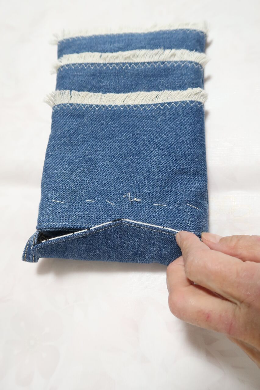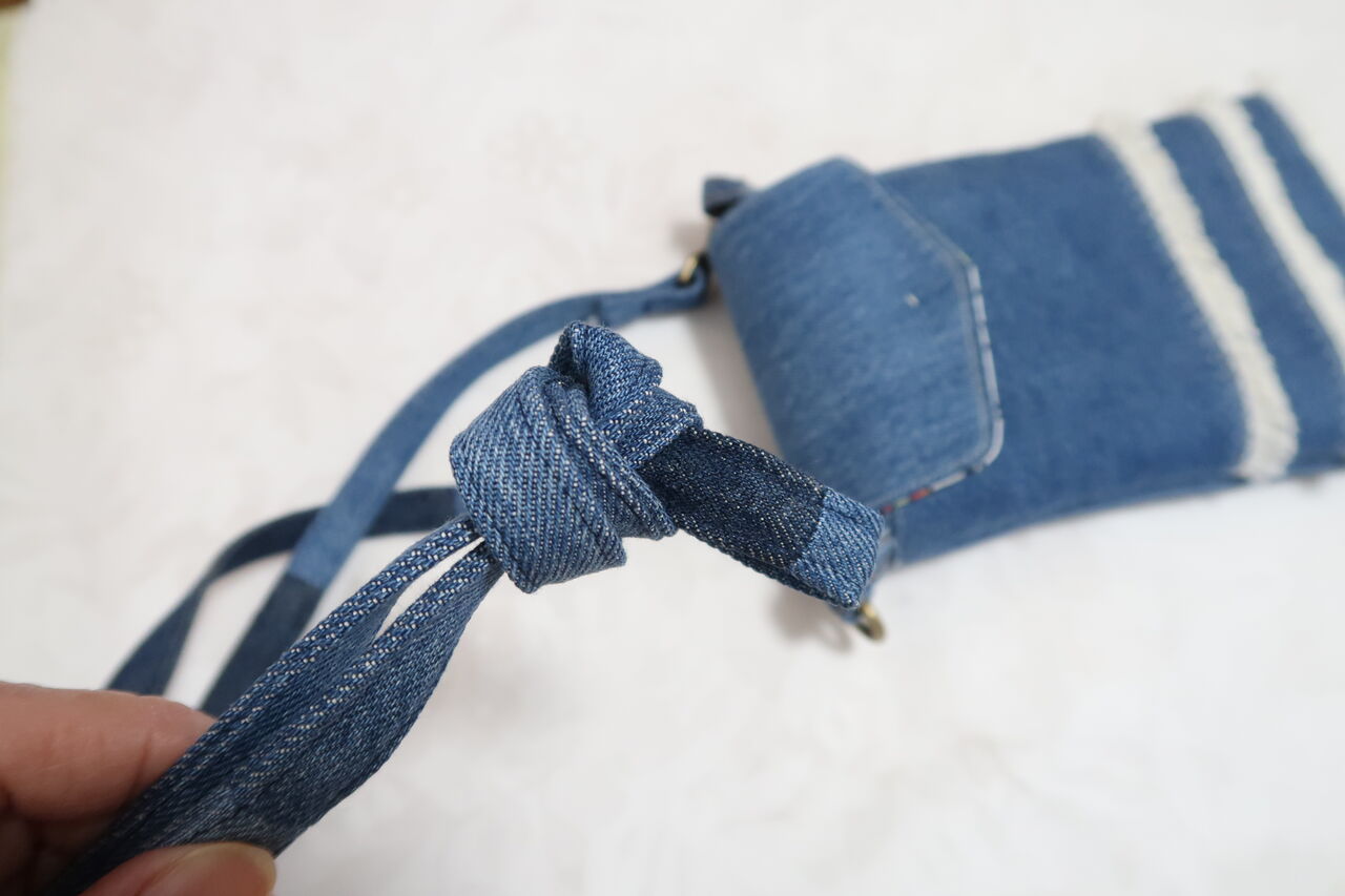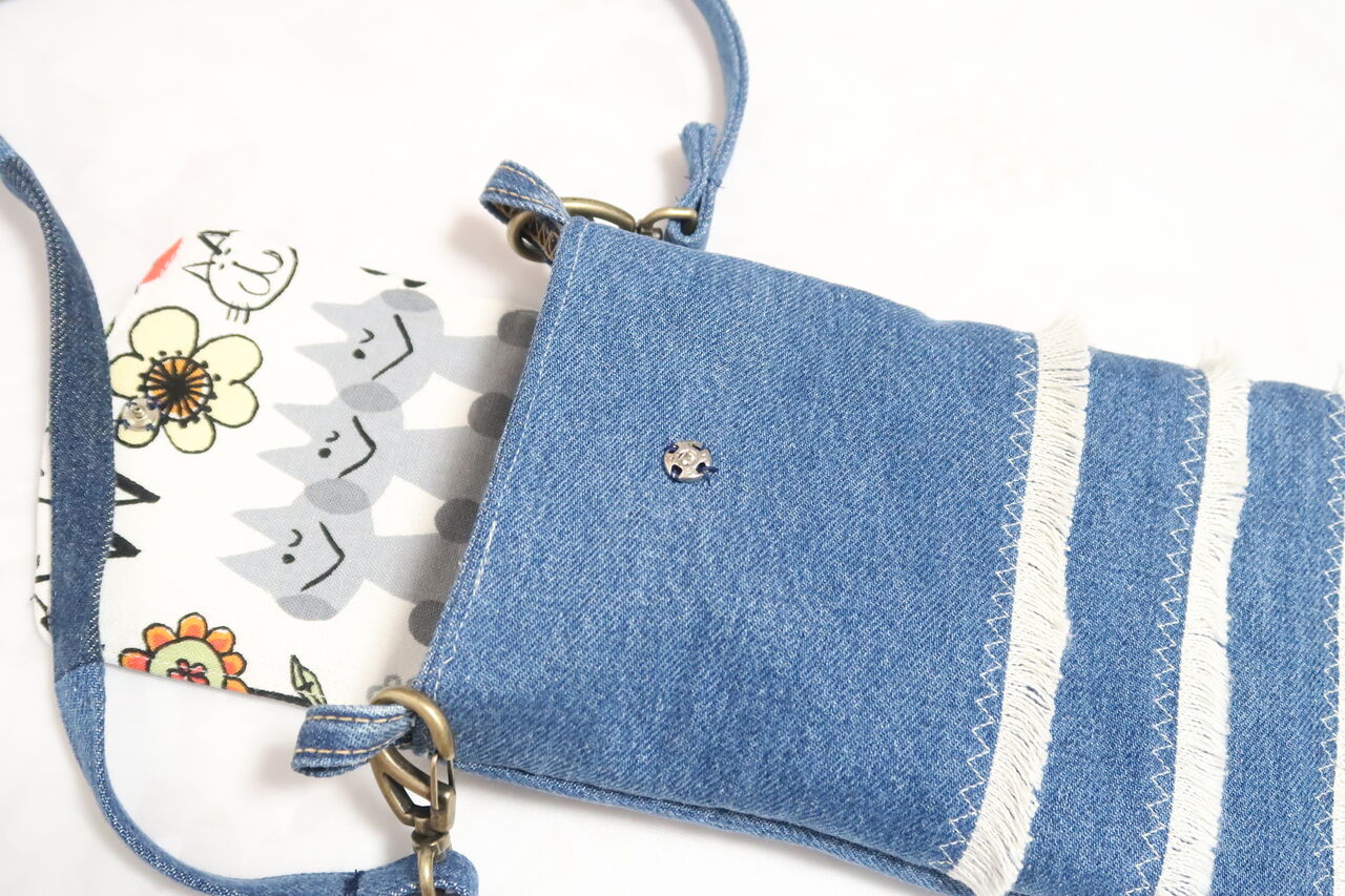 お古のジーンズでスマホ用ポーチを作りました。スマホは持っていないので正確には「ガラケーポーチ」です。お財布やメモ帳・ペンなど収納できます。