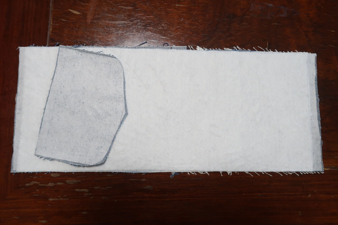 ☆フラップは、写真では厚手の接着芯だけですが、後でドミット芯も貼ったらよかったと思ったので、ドミット芯を貼りました。ドミット芯は、実寸で切って貼ります。