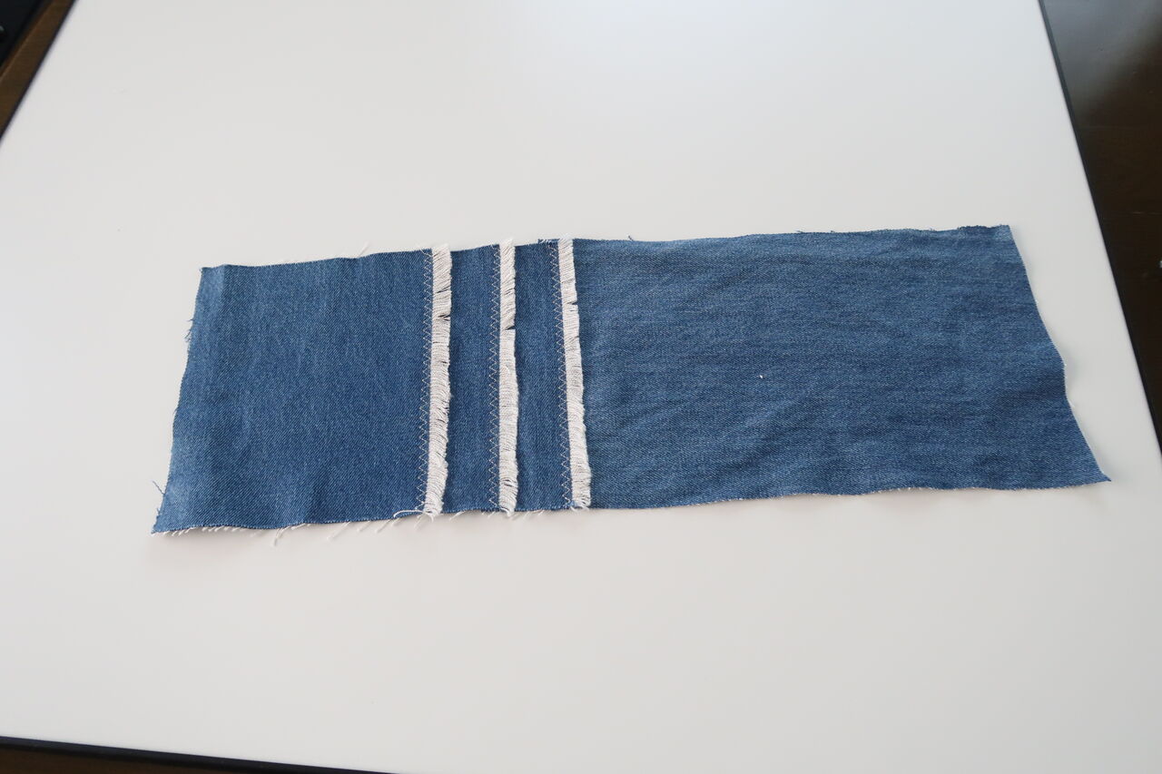 3、フリジンを施した布を点線ジグザグでつなぎます。点線ジグザグだとフリジンがほつれにくい感じです。点線ジグザグはいいアクセントにもなります。ジグザグよりきれいです。ミシン糸はフリジンの色と同じキナリにしました。