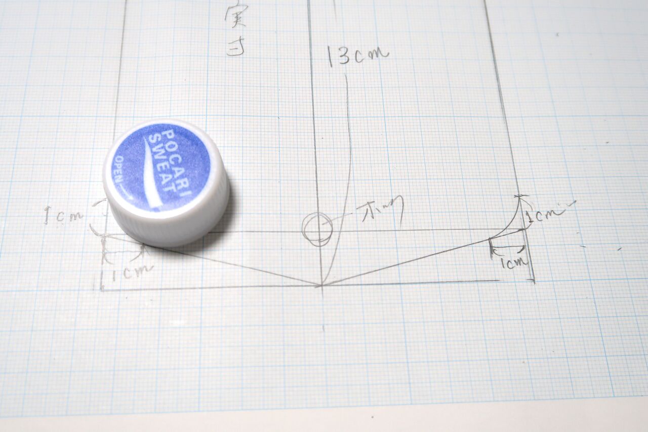 下から1.5センチのところに横に線を入れ、中心に向かって線を引きます。両サイドは、角にペットボトルのふたを置いて丸みを出しました。