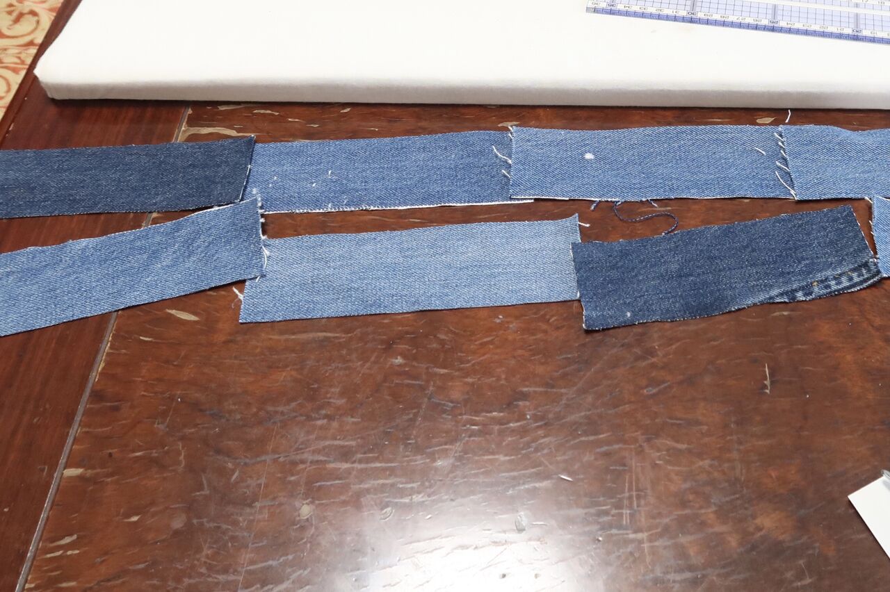 幅5センチの布を縦につなぎ合わせます。つなぐときの縫い代は1センチ。