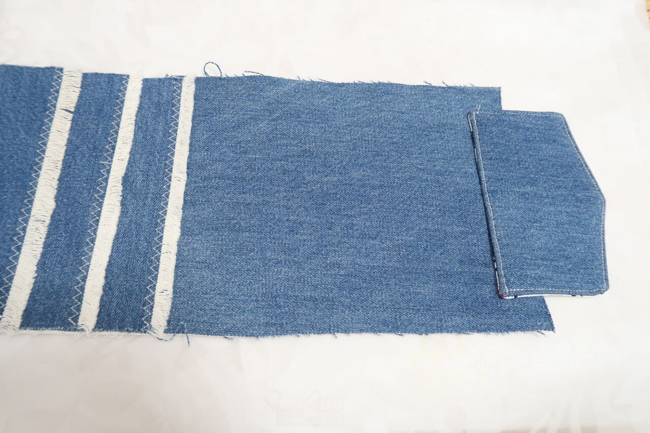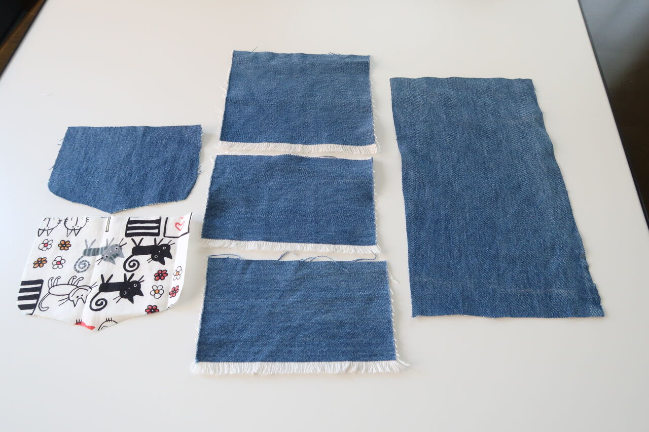 ジーンズで口布縦5センチ横17センチ2枚、内布縦17センチ横17センチ2枚、ポケット用布縦15センチ横13センチ1枚