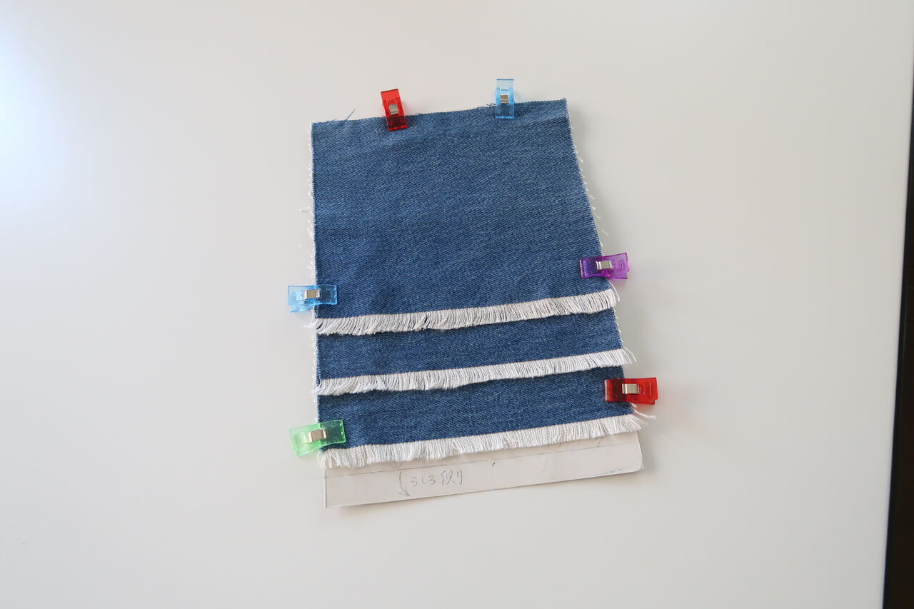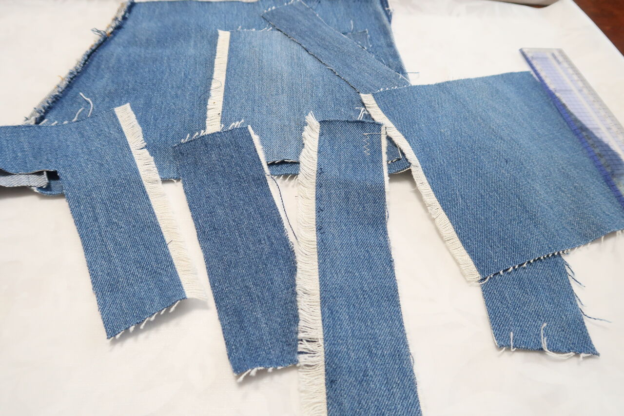 ジーンズにハサミを1センチほど入れて縦に裂くと、縦糸が簡単に取れフリジンが作れます。裂いたところの糸はボソボソしているのでハサミで整えてから縦糸をほどきます。フリジンの長さは好みで調節します。私は1、2センチにしました。