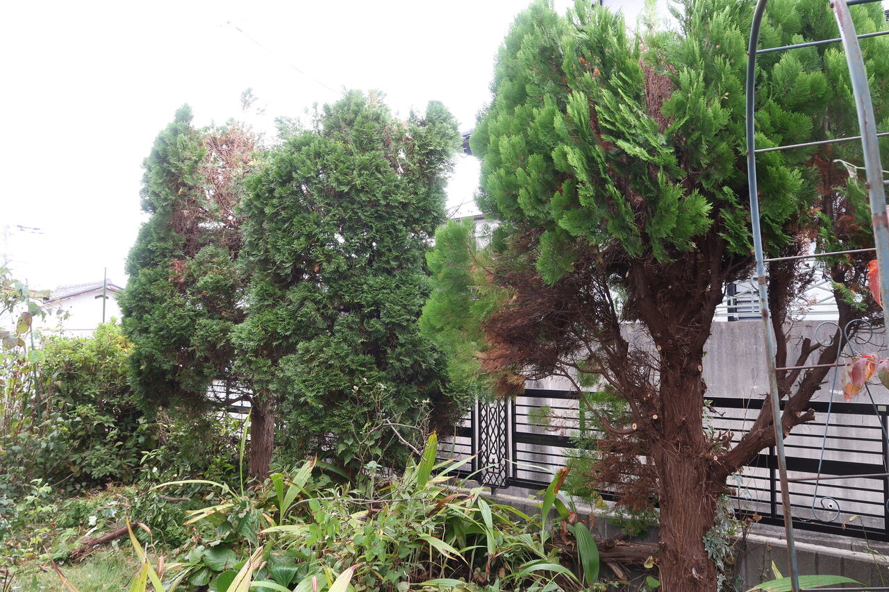 植えたばかりのころは伸びすぎた枝をピンチするだけでよかったコニファーは、高く伸びて私の手の届かないほど成長しました。「5メートルくらいにしかならない」「成長がゆっくり」というものを探して植えましたが、みんなよく成長しました。