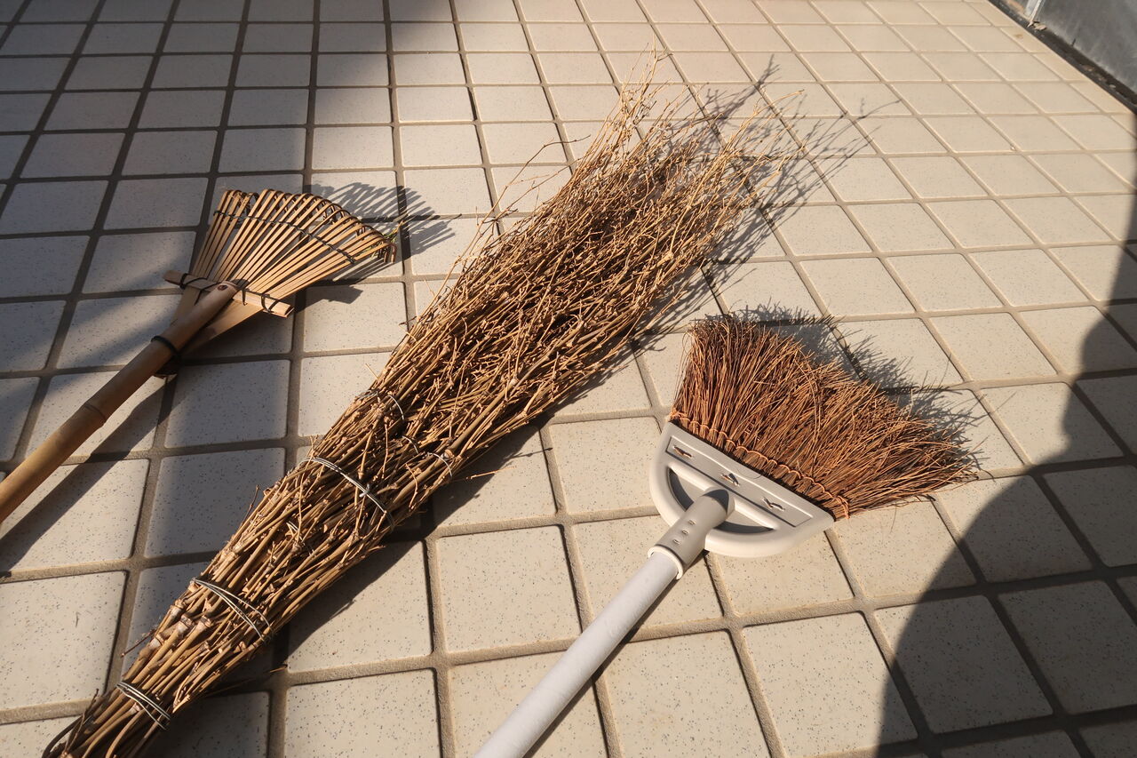 箒は犬走やタイルを掃くのに最適です。熊手も竹箒も役に立ちません。適材適所ですね。改めて道具の素晴らしさを知りました。