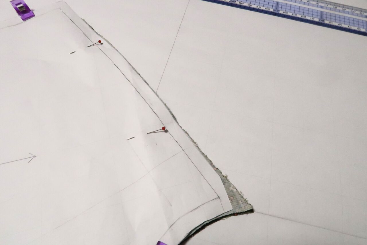 前と後ろの見ごろの長さが違います。前後身ごろの縫い止まりの印も合いません。違う型紙の印をつけたようです。仕方ない、また描き直しです。