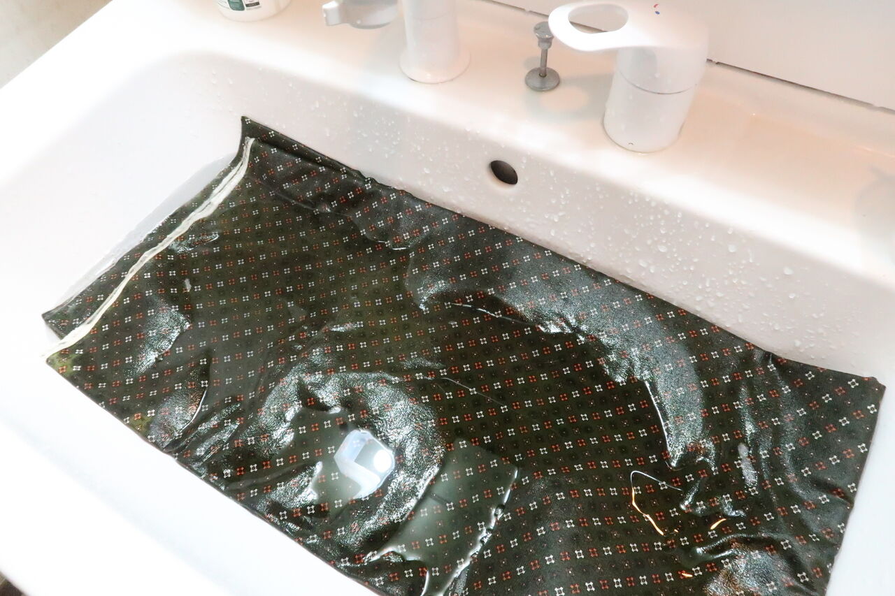 少量の洗剤を入れて水通し。こうすれば色落ちもチェックできます。