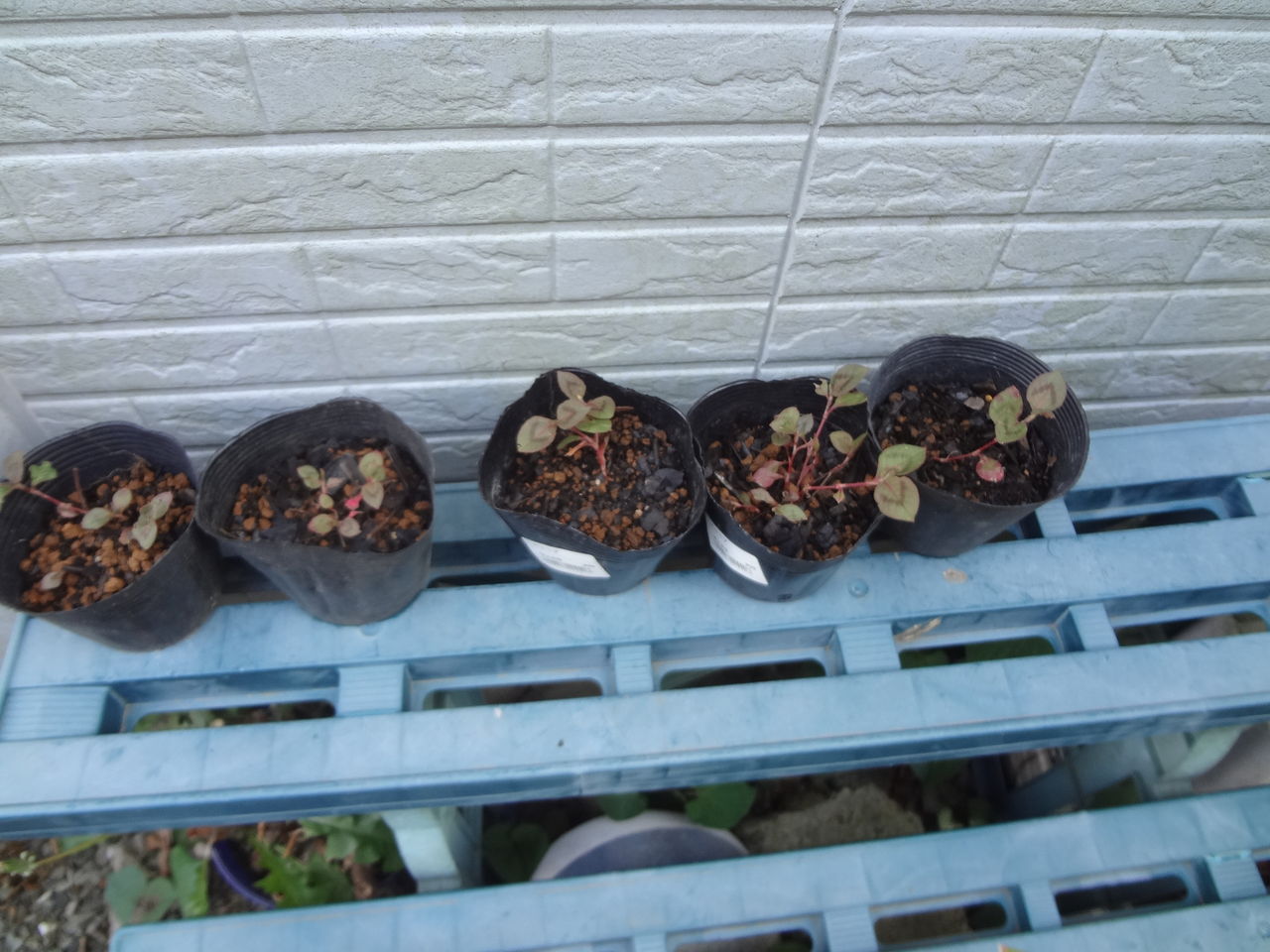 こちらはこぼれ種から出た芽。左の大きな葉は、昨年伸びたツルから発生した新芽。増やすのは昨年伸びたツルから出来た新芽を使うと、株が早く育ちます。