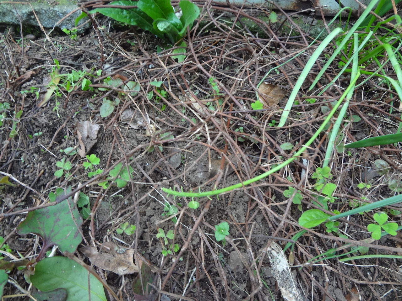 枯れた地上部の草を取り除きます。地上部が枯れても根は生きていいて翌年5月ごろに節の所に隠した芽から葉を展開させ復活します。根のついているところは抜かないようにするといいです。こぼれ種でも増えていきます。